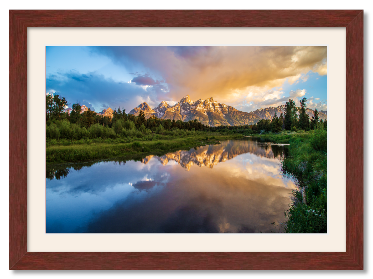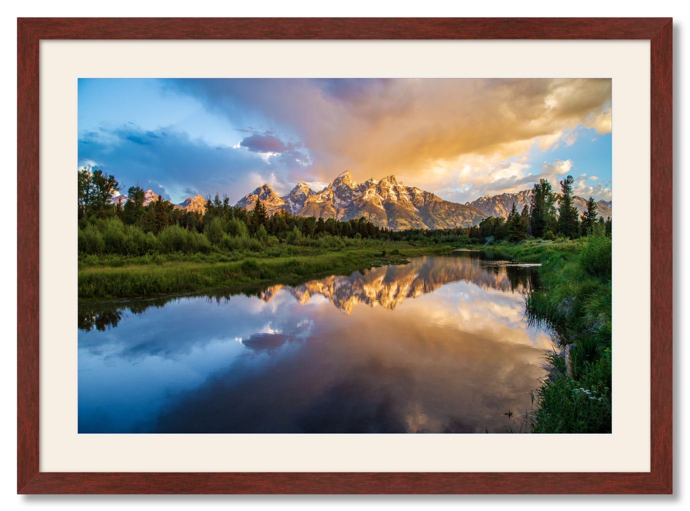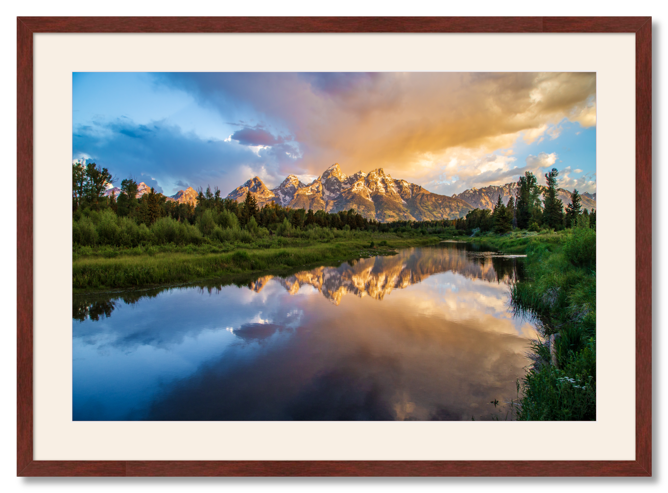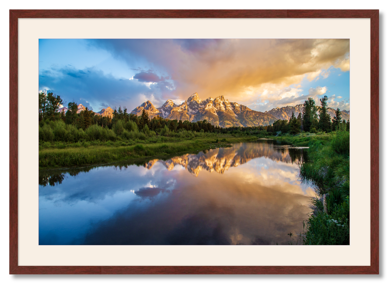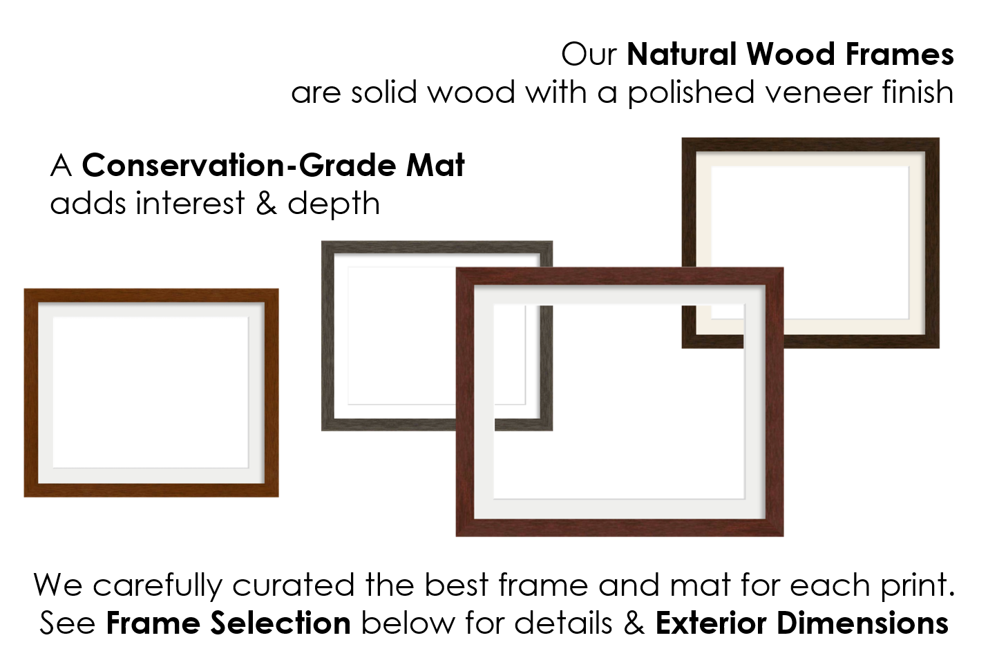 A mahogany frame and Devonshire mat create an elegant setting for your new wall art. Frame exterior dimensions are:
