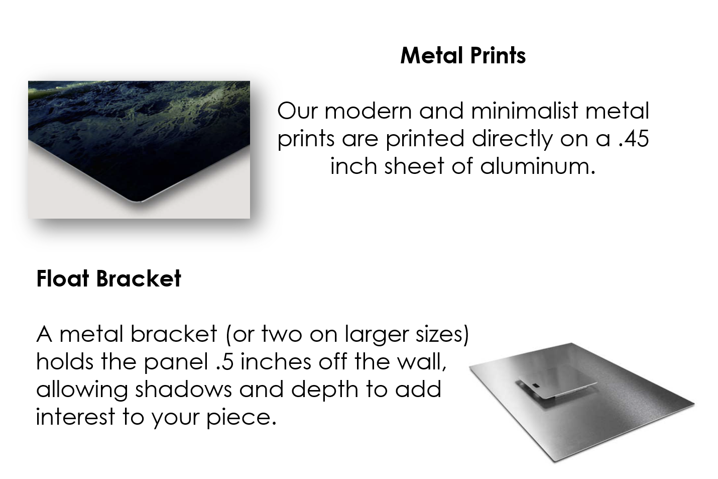 Want something really sleek and modern? Try our metal prints. We use a sophisticated dye-sublimation process to reproduce photographs on a .045“ ChromaLuxe® aluminum panel.
